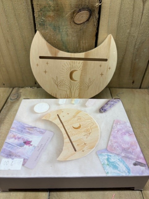 Wooden tarot card holder with stars and moon design.