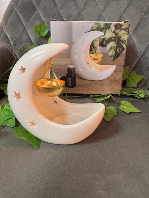 A lovely moon shaped oil burner. Use you favourite fragrance or essential oil to fill you room with scent.